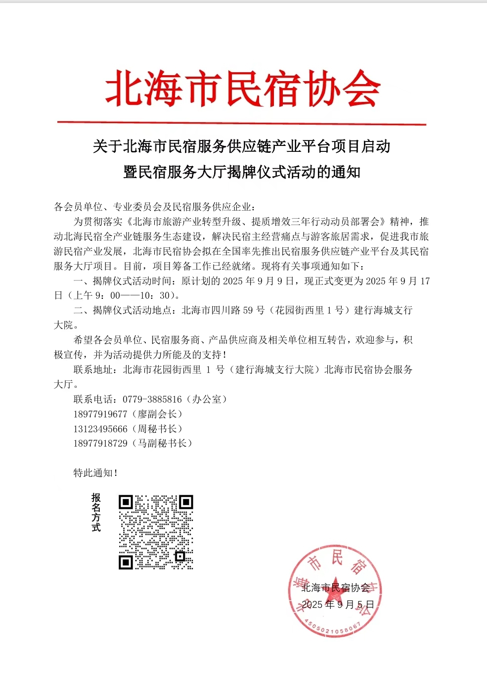 关于北海市民宿服务供应链产业平台项目启动暨民宿服务大厅揭牌仪式活动的通知