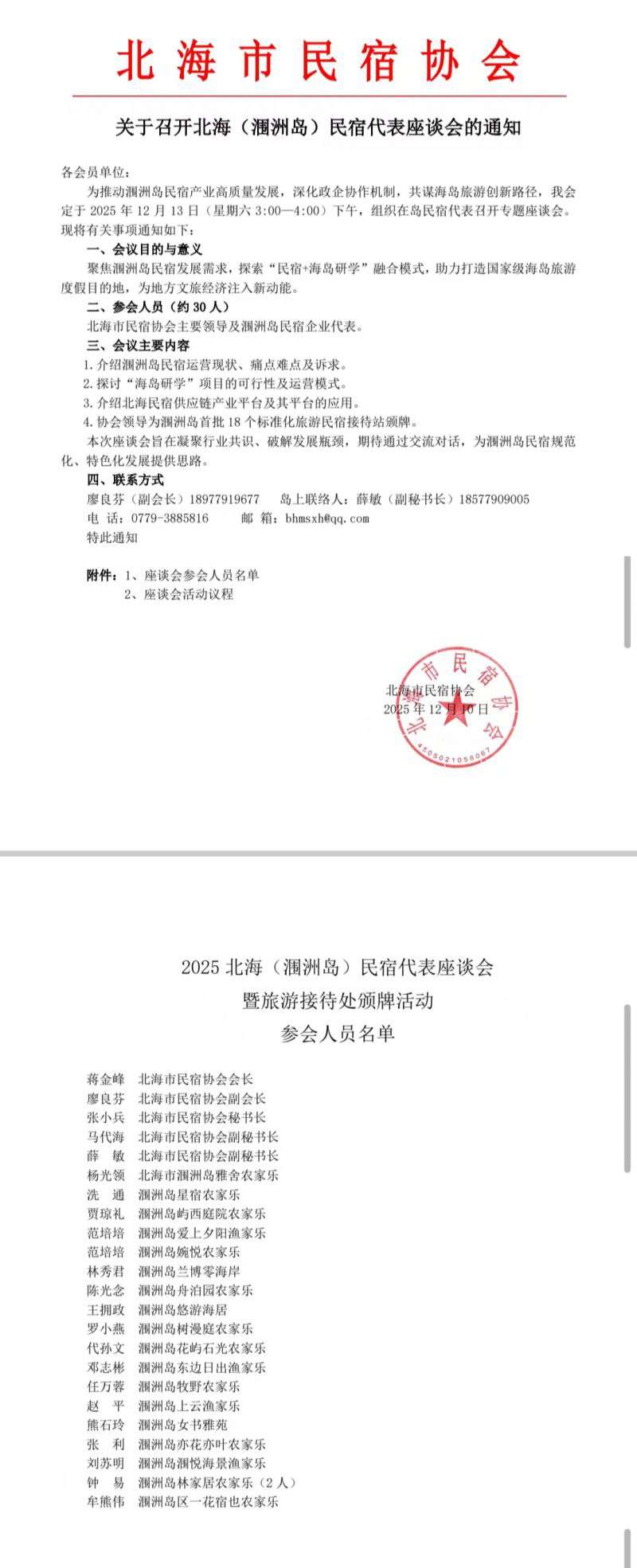 为推动涠洲岛民宿产业高质量发展,深化政企协作机制,共谋海岛旅游创新路径,我会定于2025年12月13日(星期六3:00-4:00)下午,组织在岛民宿代表召开专题座谈会。现将有关事项通知如下: