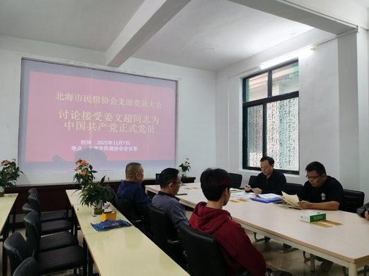 姜文超同志于2024年11月1日被批准为中国共产党预备党员,经过支部一年的培养教育和考察,该同志已具备了正式党员的基本素养,2025年10月28日至11月6日进行了转正前的公示,未收到群众的问题反映。2025年11月7日,北海市民宿协会党支部党员大会讨论通过了姜文超同志的转正申请,经无记名投票表决,一致同意姜文超同志按期转为中国共产党正式党员。